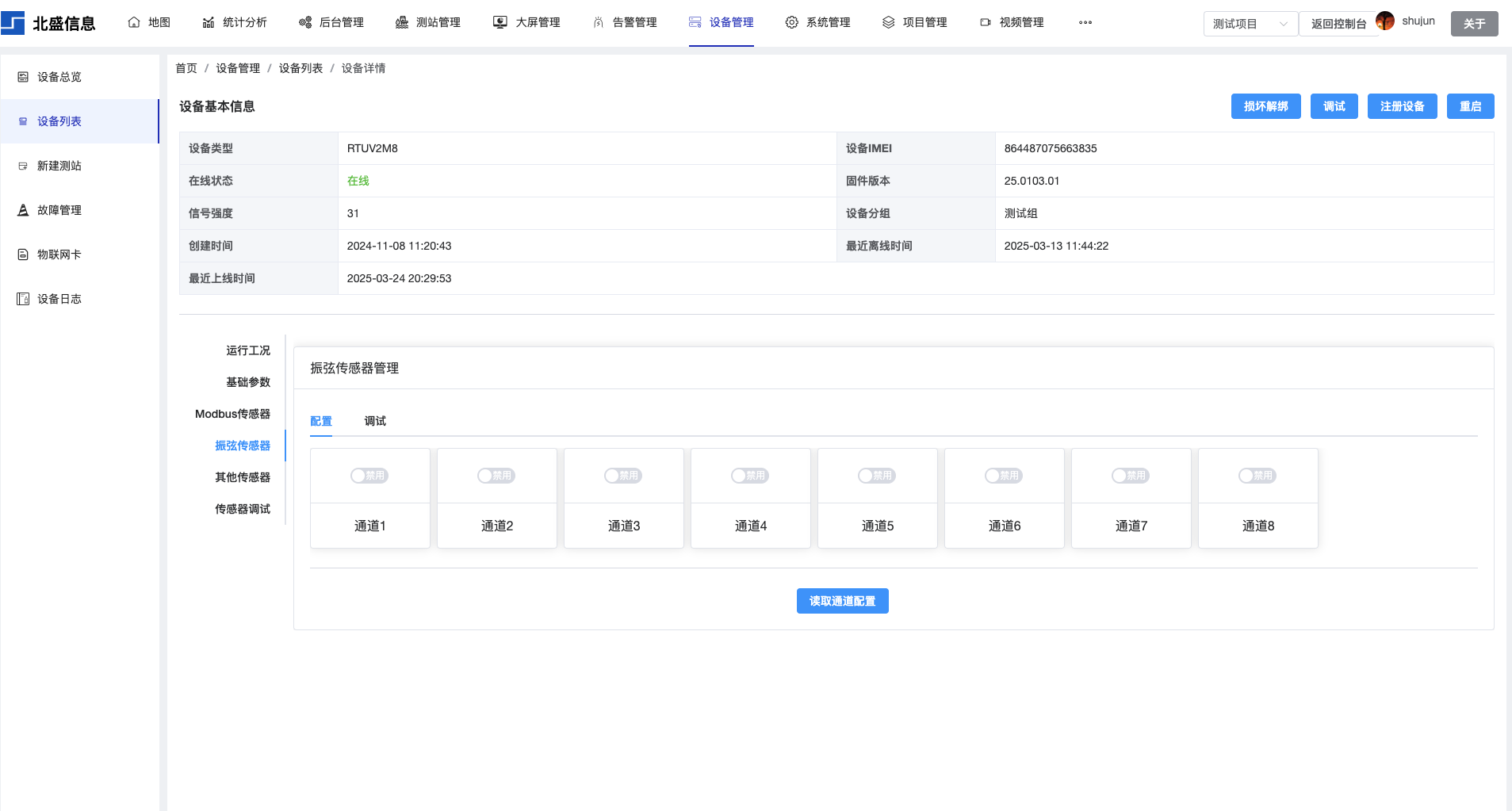 只需要打开振弦传感器的通道,设备就会定时采集和上报数据。