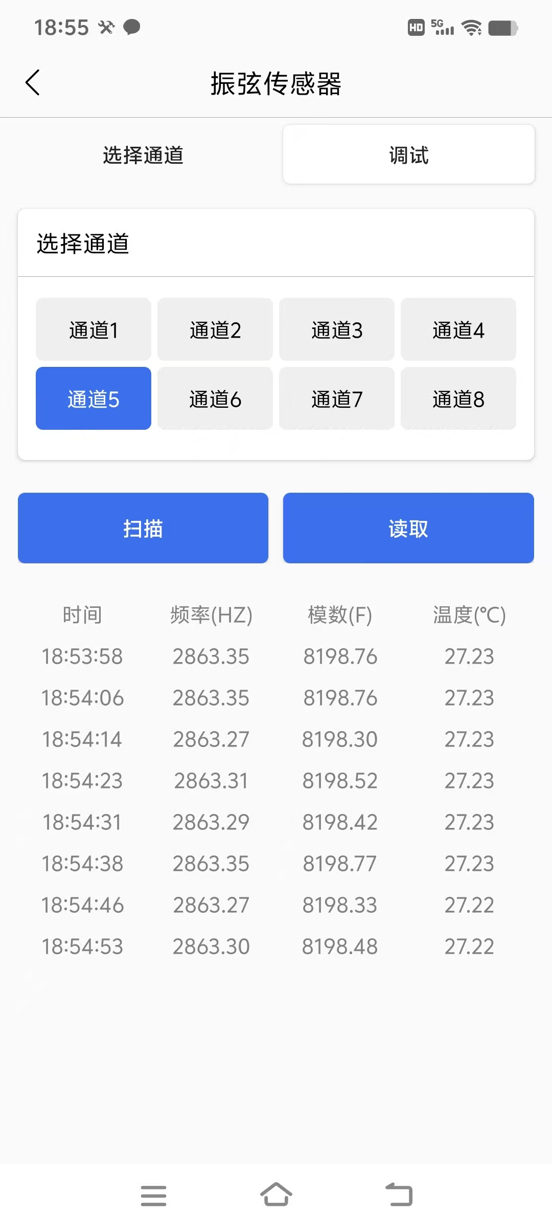 打开振弦采集通道之后,即可直接【扫描】,然后等待大约 5 秒(默认,可调)后,【读取】振弦传感器的原始值。